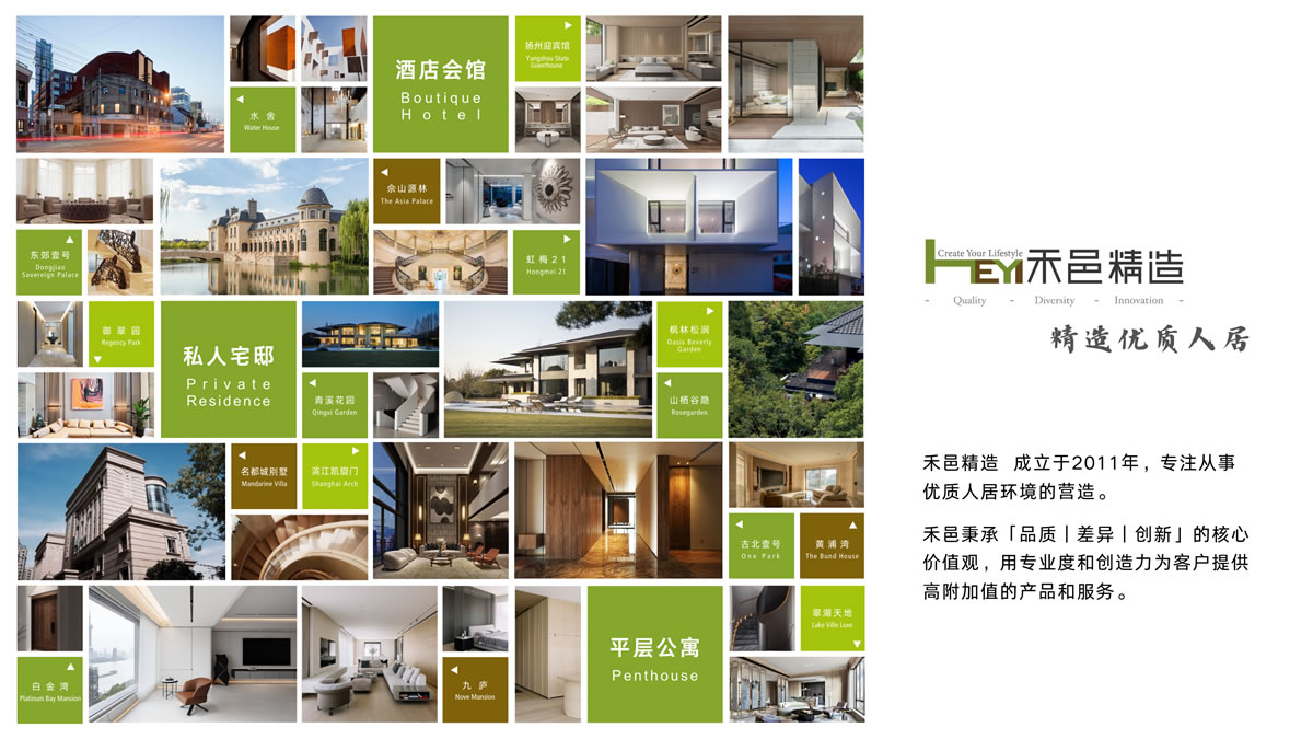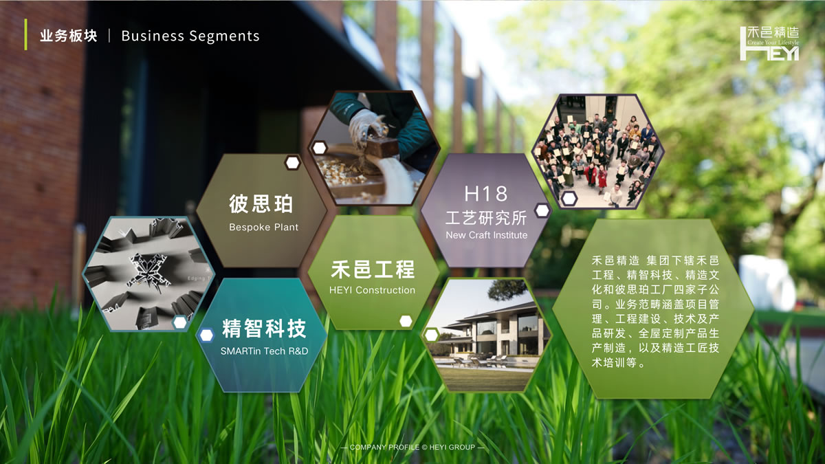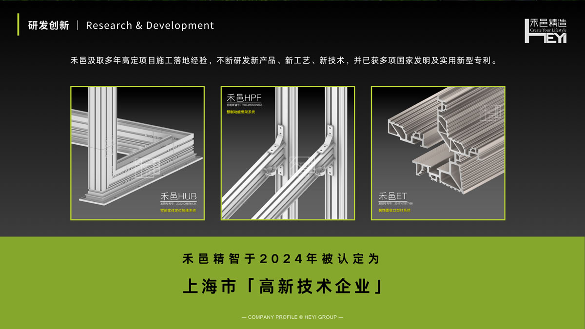 禾邑精造 成立于2011年,专注从事优质人居环境的营造。 禾邑秉承「品质|差异|创新」的核心价值观,用专业度和创造力为客户提供高附加值的产品和服务。 品牌愿景 | Branding Vision 精工智造 禾邑为家 禾为稻,处四季之中得天地之气; 邑为城,立闹市之间容桃源之境。 禾邑,专注于优质人居; 精造,传递出执着态度。 品牌愿景 | Branding Vision 精工智造 禾邑为家 禾为稻,处四季之中得天地之气; 邑为城,立闹市之间容桃源之境。 禾邑,专注于优质人居; 精造,传递出执着态度。 研发创新 | Research & Development 禾邑汲取多年高定项目施工落地经验,不断研发新产品、新工艺、新技术,并已获多项国家发明及实用新型专利。 禾邑精智于2024年被认定为 上海市「高新技术企业」